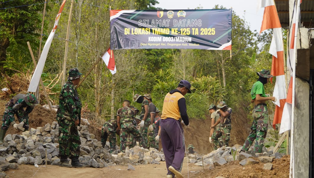 MADIUN, BUSERJATIM.COM GROUP, 5 Agustus 2025, – Program TNI Manunggal Membangun Desa (TMMD) ke 125 kembali menjadi ajang nyata pengabdian dan kebersamaan antara TNI dan masyarakat. Di tengah teriknya matahari dan beratnya pekerjaan fisik, tampak anggota Satgas TMMD dan warga desa bergotong royong membangun infrastruktur dengan semangat dan senyum.