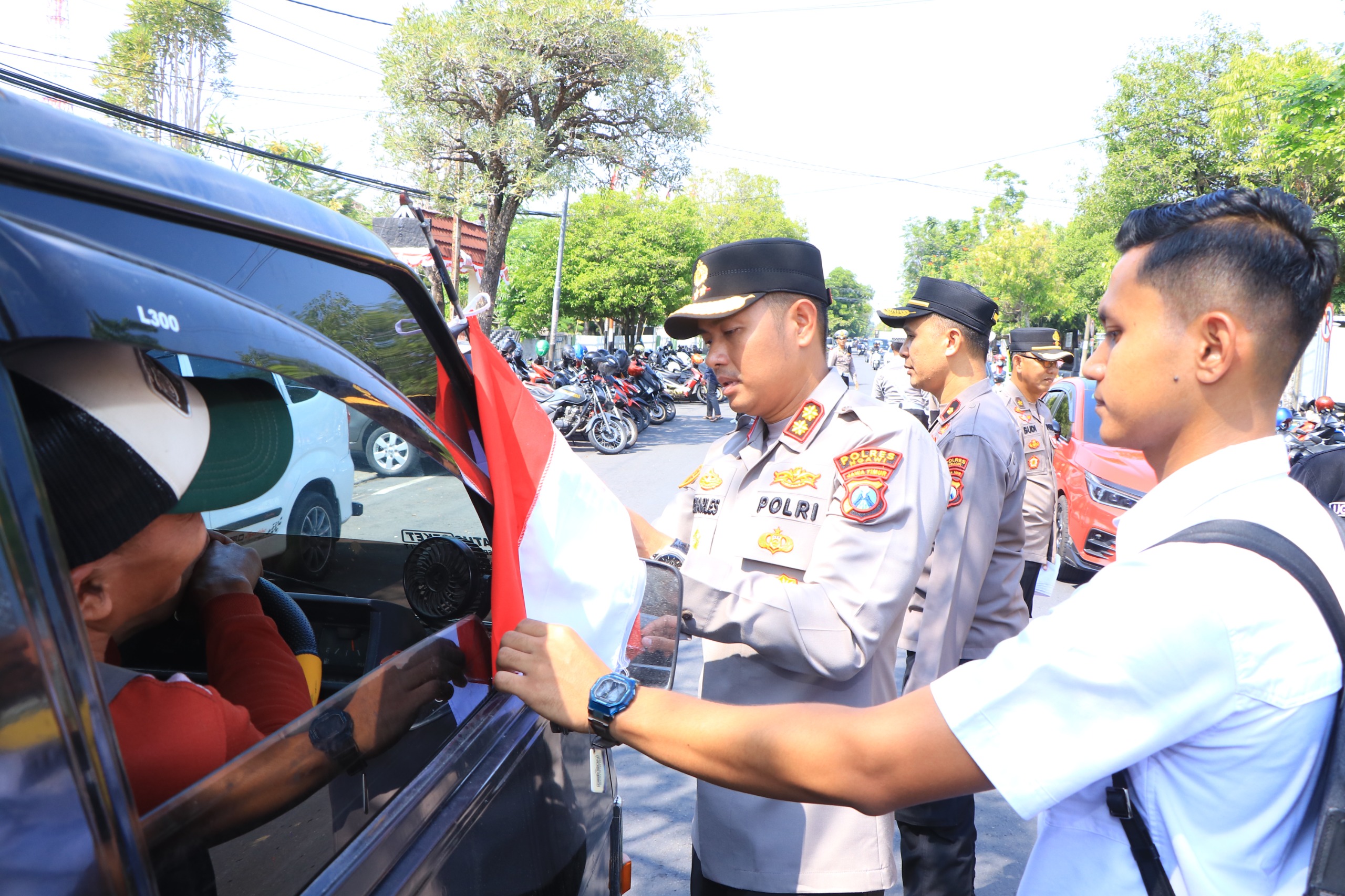 Dengan penuh semangat, Kapolres bersama sejumlah personel Polres Ngawi langsung turun ke jalan menyapa pengendara, membagikan bendera, dan membantu memasangkannya di kendaraan.