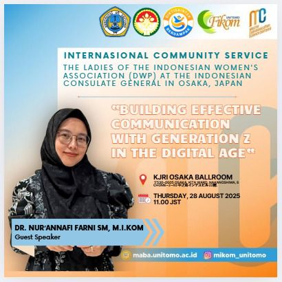 Dalam kesempatan tersebut, Dr. Nur’annafi FSM, M.I.Kom., mewakili FIKOM Unitomo memberikan edukasi bertema “Building Effective Communication With Generation Z in The Digital Age” kepada para ibu-ibu Dharma Wanita di lingkungan Konsulat Jenderal Republik Indonesia (KJRI) Osaka.