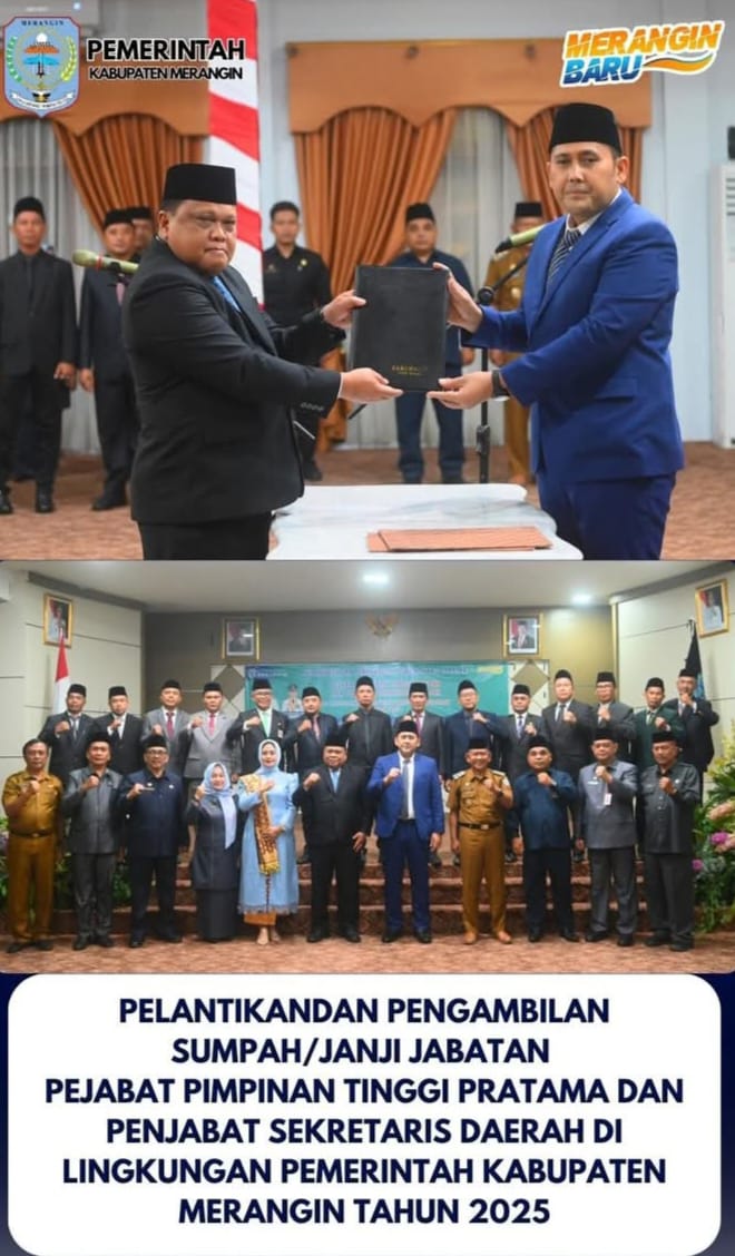 Merangin Jambi-Bupati Merangin M Syukur melantik 15 Pejabat Pimpinan Tinggi (PPT) Pratama di lingkup Pemkab Merangin, bertempat di auditorium Rumah Dinas Bupati. Senin (1/9/2025) Malam.