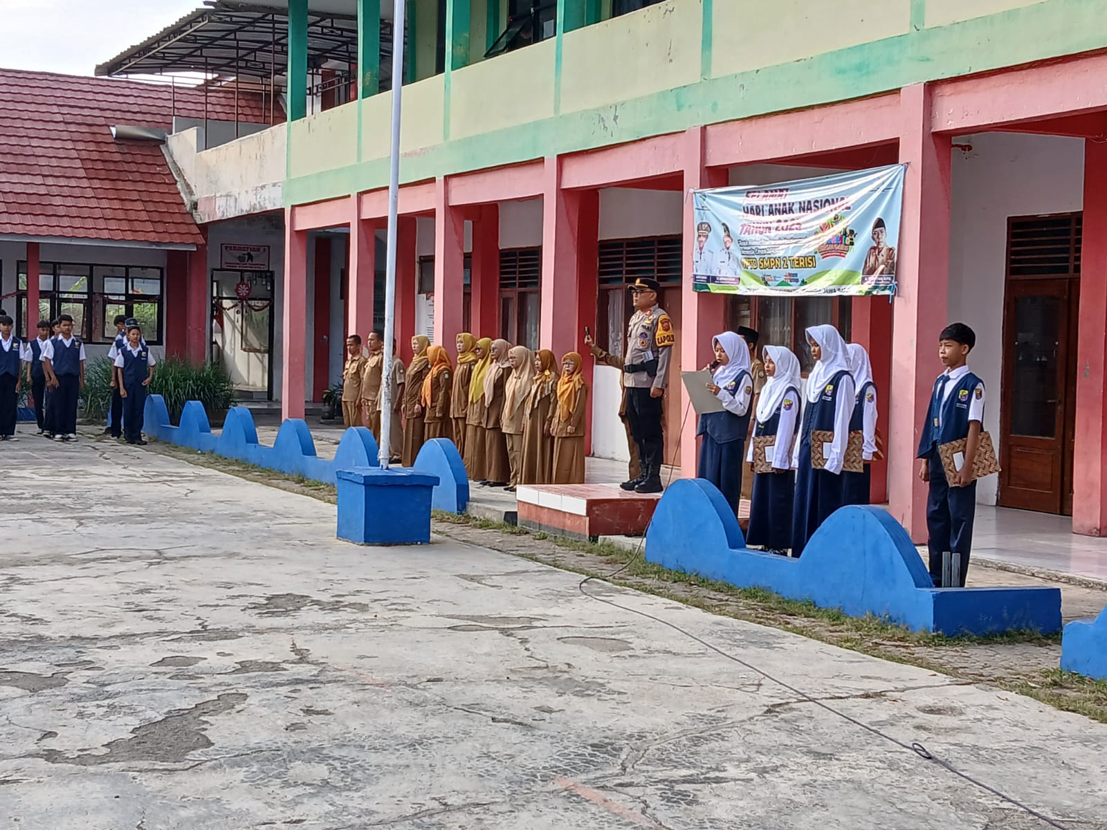 Turut hadir dalam kegiatan ini Kapolsek Terisi AKP Joni, S.H., Upacara berlangsung khidmat di halaman sekolah, menjadi momentum Polri menyampaikan pesan moral dan hukum secara langsung kepada pelajar.