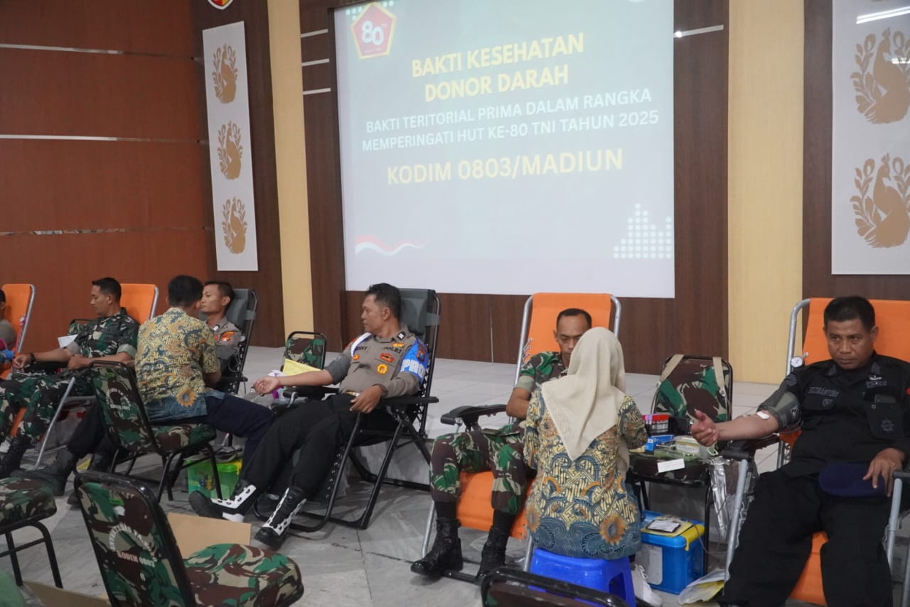MADIUN, BUSERJATIM.COM GROUP – Setetes darah adalah kehidupan, tanda kasih yang mengalir tanpa henti. Dari tangan yang rela memberi, lahirlah harapan baru bagi mereka yang membutuhkan. Dalam semangat pengabdian itulah, Kodim 0803/Madiun melaksanakan kegiatan donor darah sebagai bagian dari Bakti Teritorial Prima dalam rangka HUT ke-80 TNI Tahun 2025.