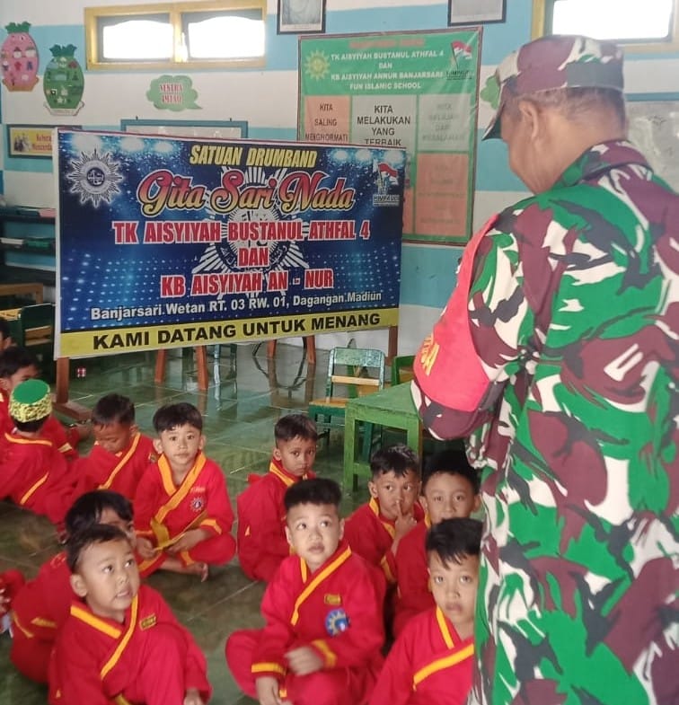 MADIUN, BUSERJATIM.COM GROUP – Babinsa Desa Banjarsari Wetan, Koramil 0803-14/Dagangan, Serma Nasib Subagya, hadir di tengah-tengah siswa TK Aisyiyah An Nur untuk memberikan motivasi belajar, Selasa (tanggal sesuai kegiatan). Kehadiran Babinsa ini menjadi wujud kepedulian terhadap tumbuh kembang generasi muda sejak usia dini.