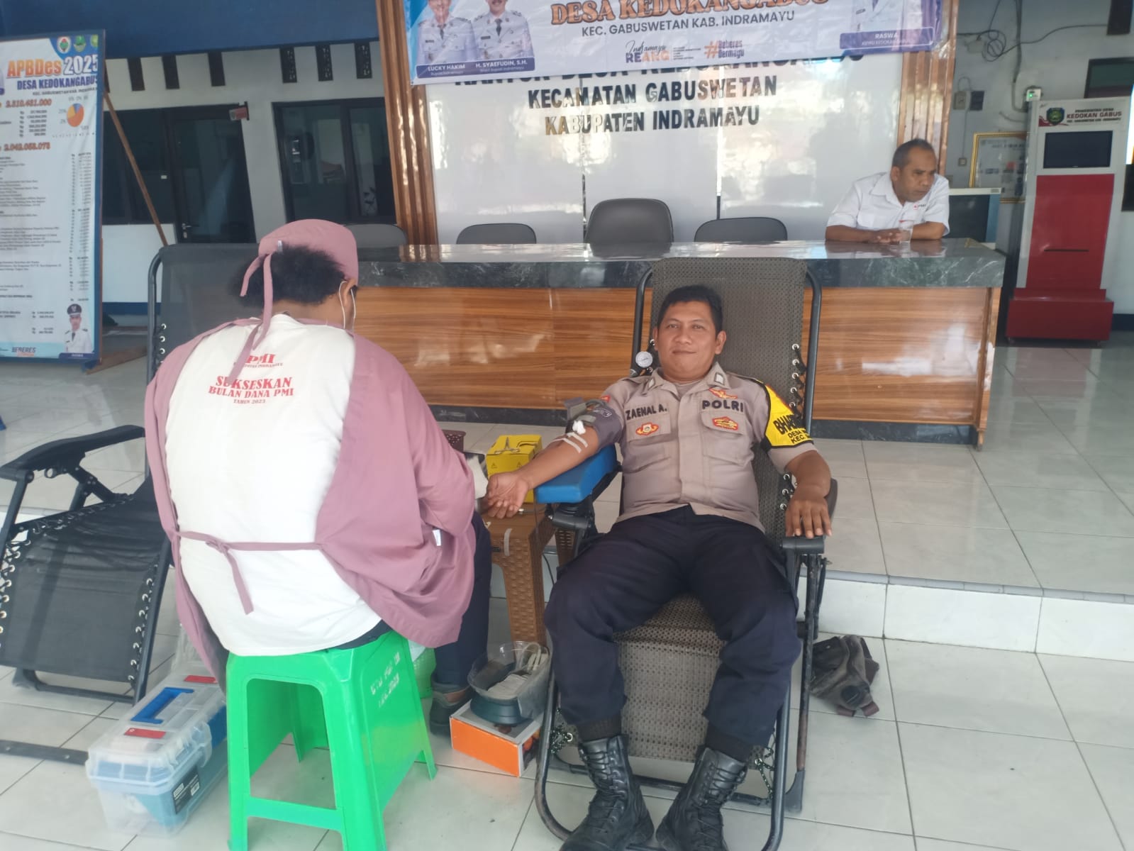 Indramayu,- Sejumlah Personel Polsek Gabuswetan jajaran Polres Indramayu Polda Jabar mengikuti donor darah, di Aula kantor Balai Desa Kedokangabus Kecamatan Gabuswetan, Kabuapten Indramayu, Senin (15/9/2025).
