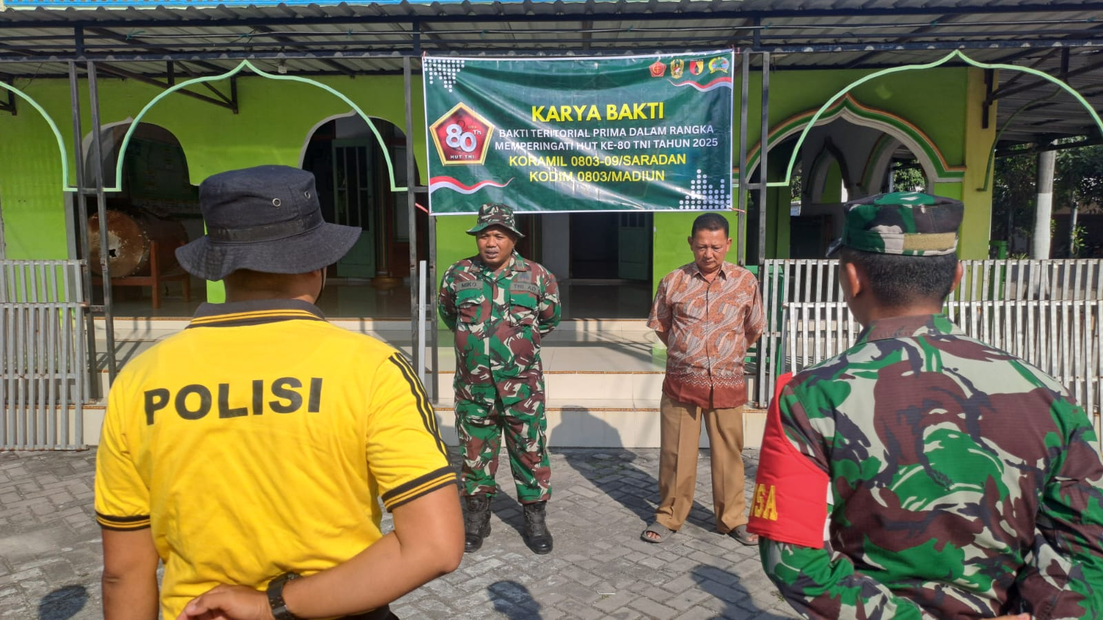 Danramil 0803/09 Saradan kapten Inf Lulus melalui Bati Tuud Peltu Sujadmiko menyampaikan bahwa karya bakti ini merupakan wujud kepedulian TNI terhadap tempat ibadah sekaligus bentuk pengabdian nyata kepada masyarakat.