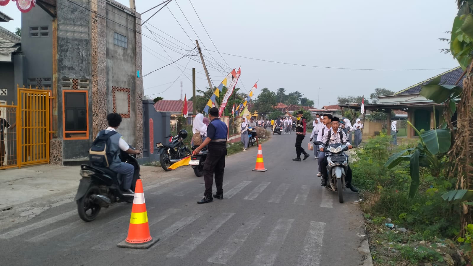 Indramayu – Guna memberikan rasa aman dan nyaman kepada masyarakat, personel Polsek Bongas Polres Indramayu Polda Jabar melaksanakan kegiatan pengaturan lalu lintas (Gatur Pagi) di depan SMP Negeri 1 Bongas, Kabupaten Indramayu, Selasa (30/9/2025).