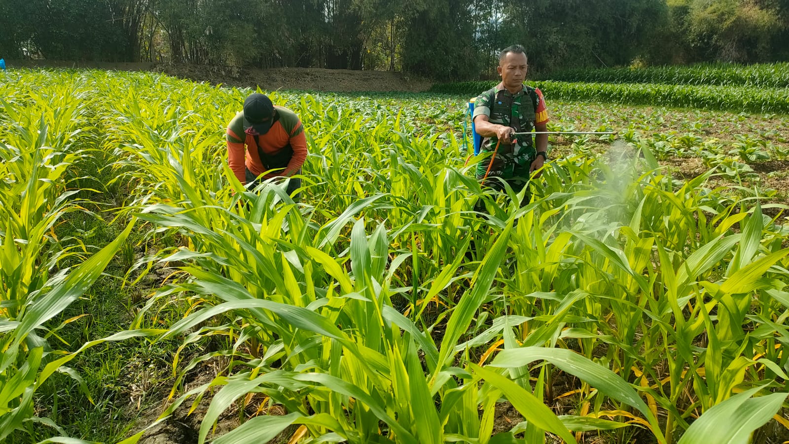 Petani Semprot Hama Tanaman Jagung, Babinsa Kodim Ponorogo Dampingi