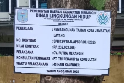 Proyek pembangunan taman kota ini dikerjakan oleh Dinas Lingkungan Hidup (DLH) Kabupaten Merangin berdasarkan kontrak pekerjaan SPK/12/PTKJL/APBDP/DLH/2025 dengan nilai Rp 232.003.666. Pelaksana proyek adalah CV Putra Merangin, sementara PT Tri Rekacipta Konsultan bertugas sebagai konsultan pengawas. Adapun waktu pelaksanaan ditetapkan selama 45 hari kalender.