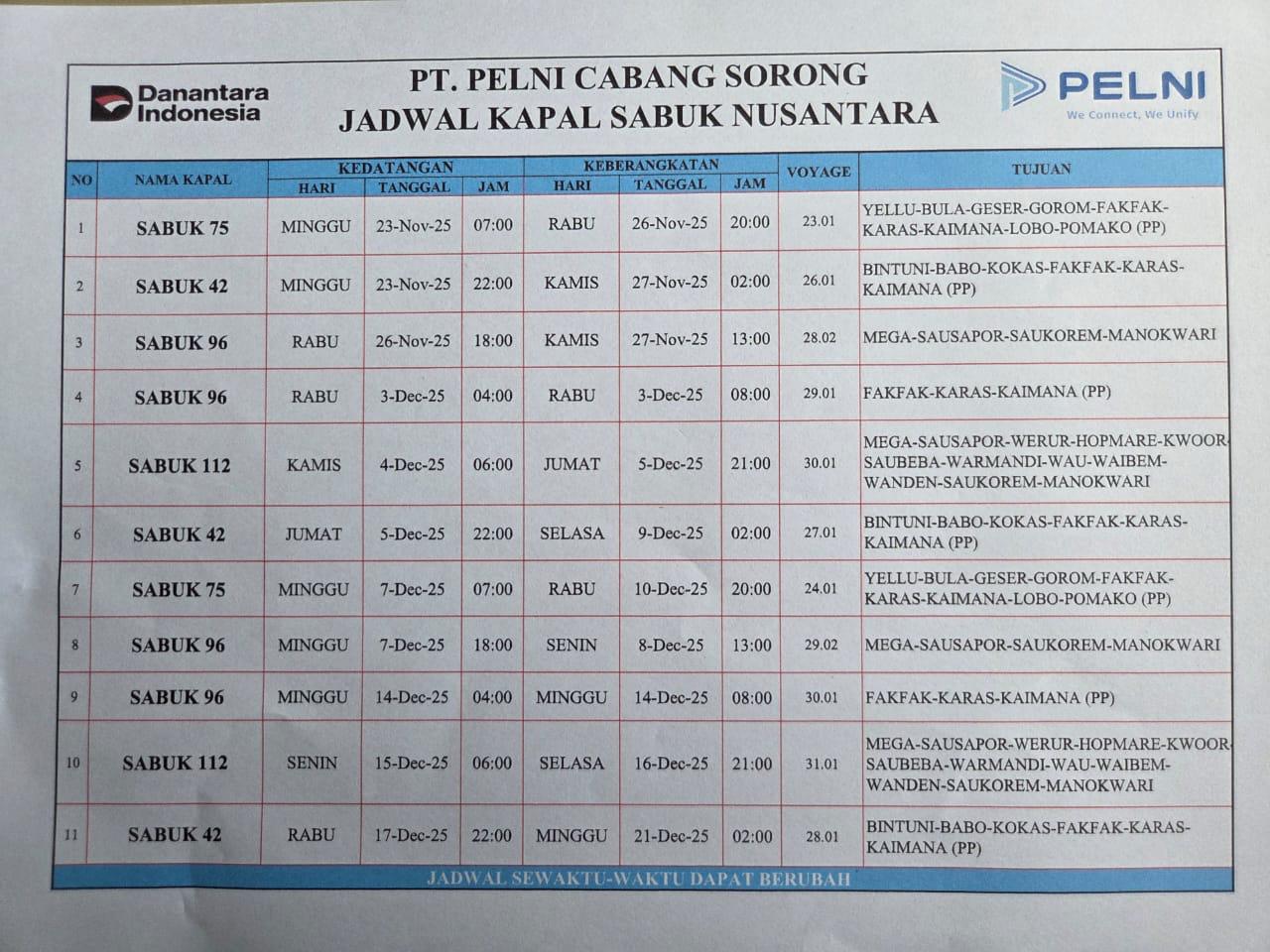 SORONG PBD, BUSERJATIM.COM GROUP (1/12/25) – PT Pelayaran Nasional Indonesia (PELNI) Cabang Sorong resmi mengumumkan jadwal lengkap kapal PELNI dan kapal perintis dari Sorong menuju seluruh rute di IndoneDiskon Tiket dan Jadwal Kapal PELNI dan Perintis di Bulan Desember 2025 dari Sorong ke Seluruh Indonesiasia untuk bulan Desember 2025. Informasi lengkap dapat diakses melalui kantor PELNI Cabang Sorong atau situs resmi PELNI.