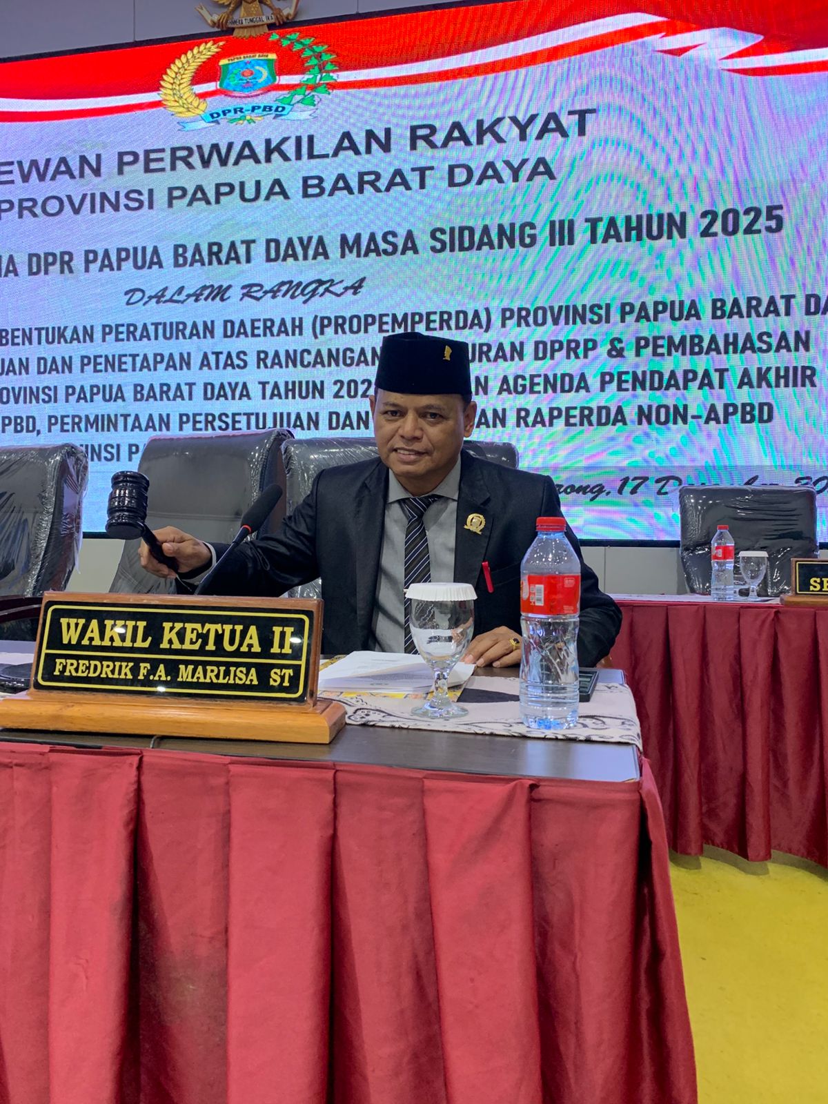 “Dengan telah disetujuinya dan ditetapkannya Program Pembentukan Peraturan Daerah Provinsi Papua Barat Daya Tahun 2026 sebagaimana tertuang dalam Surat Keputusan DPR Papua Barat Daya, maka Propemperda Tahun 2026 kami nyatakan sah,” tegas Ketua DPRP Papua Barat Daya disertai ketukan palu sebagai tanda pengesahan.