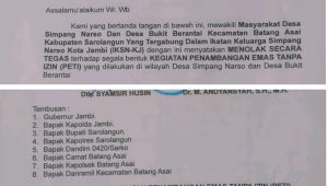 Peryataan sikap ikaran keluarga besar simpang Narso kota jambi ( IKSN- KJ ), dengan mempertimbangkan hal tersebut, kami menolak dan tidak memberikan izin kegiatan penambangan emas ilegal ( PETI) di wilayah Desa Simpang Narso dan desa bukit berantai Kecamatan Batang Asai Kabupaten Sarolangun provinsi Jambi.