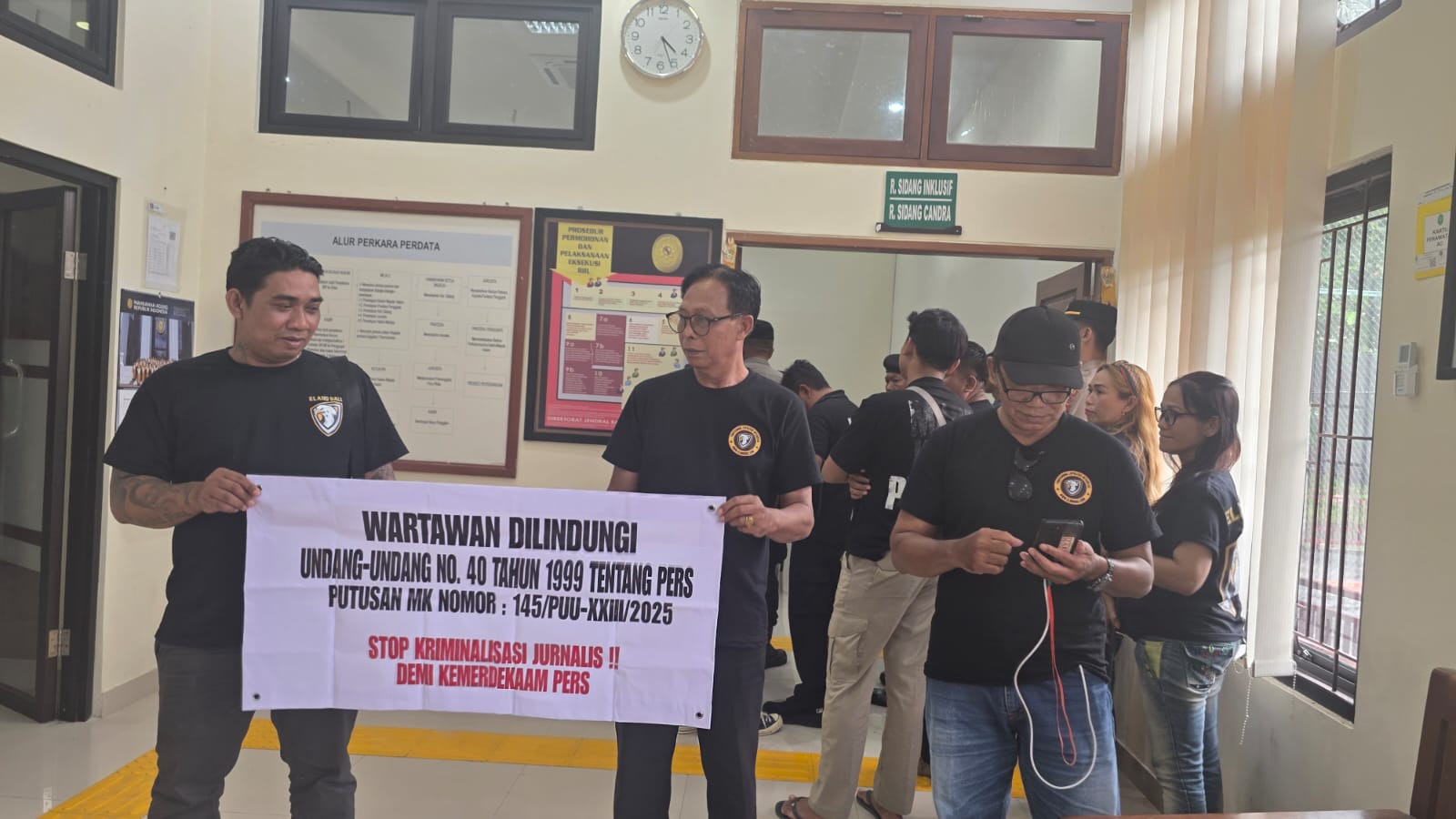 Di luar gedung pengadilan, suara solidaritas menggema. Insan pers dari berbagai media, termasuk Tim ELANGBALI, menggelar aksi damai dengan membentangkan spanduk bertuliskan: