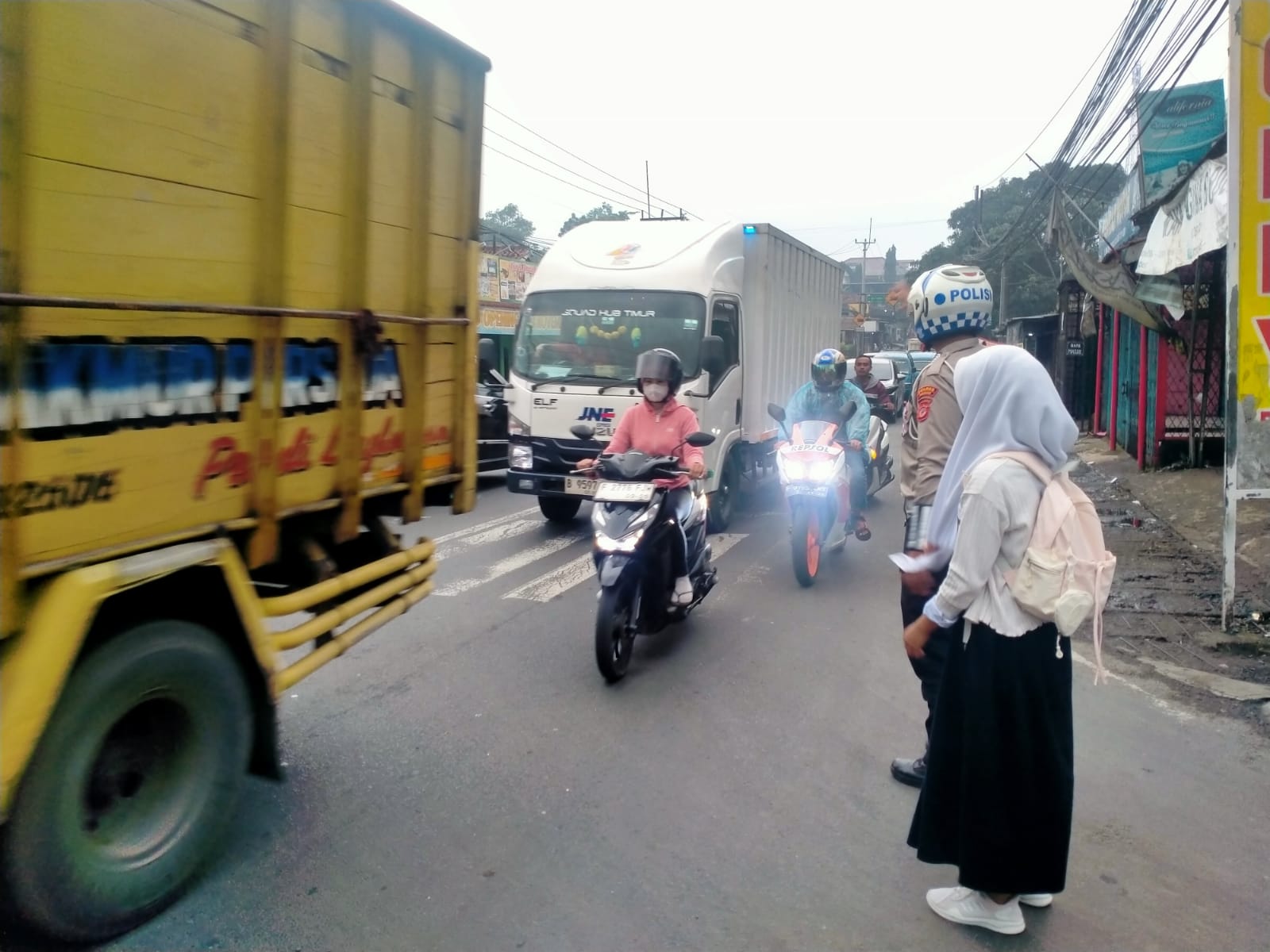 Anggota Lantas Polsek Ciampea Polres Bogor membantu masyarakat mengatur lalulintas dan ketika hendak menyebrang jalan, petugas juga melakukan pengaturan pengendara kendaraan bermotor agar terciptanya kamseltibcarlantas.
