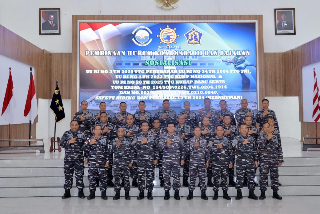 SORONG KATAPOP, BUSERJATIM.COM GROUP — Dinas Hukum Armada III menggelar Pembinaan Hukum dan Sosialisasi Kitab Undang-Undang Hukum Pidana (KUHP), Undang-Undang TNI, Keankuman, serta Safety Riding yang dilaksanakan di Gedung Serba Guna Mas Mapardi Mako Armada III, Katapop (18/02/26). Kegiatan tersebut dipimpin langsung oleh Panglima Armada III Laksamana Muda TNI Dato Rusman SN., S.E., M.Si., M.Tr.Opsla., serta diikuti oleh Pejabat Utama, para Kepala Satuan Kerja, seluruh Perwira, Bintara, Tamtama, dan PNS jajaran Armada III.