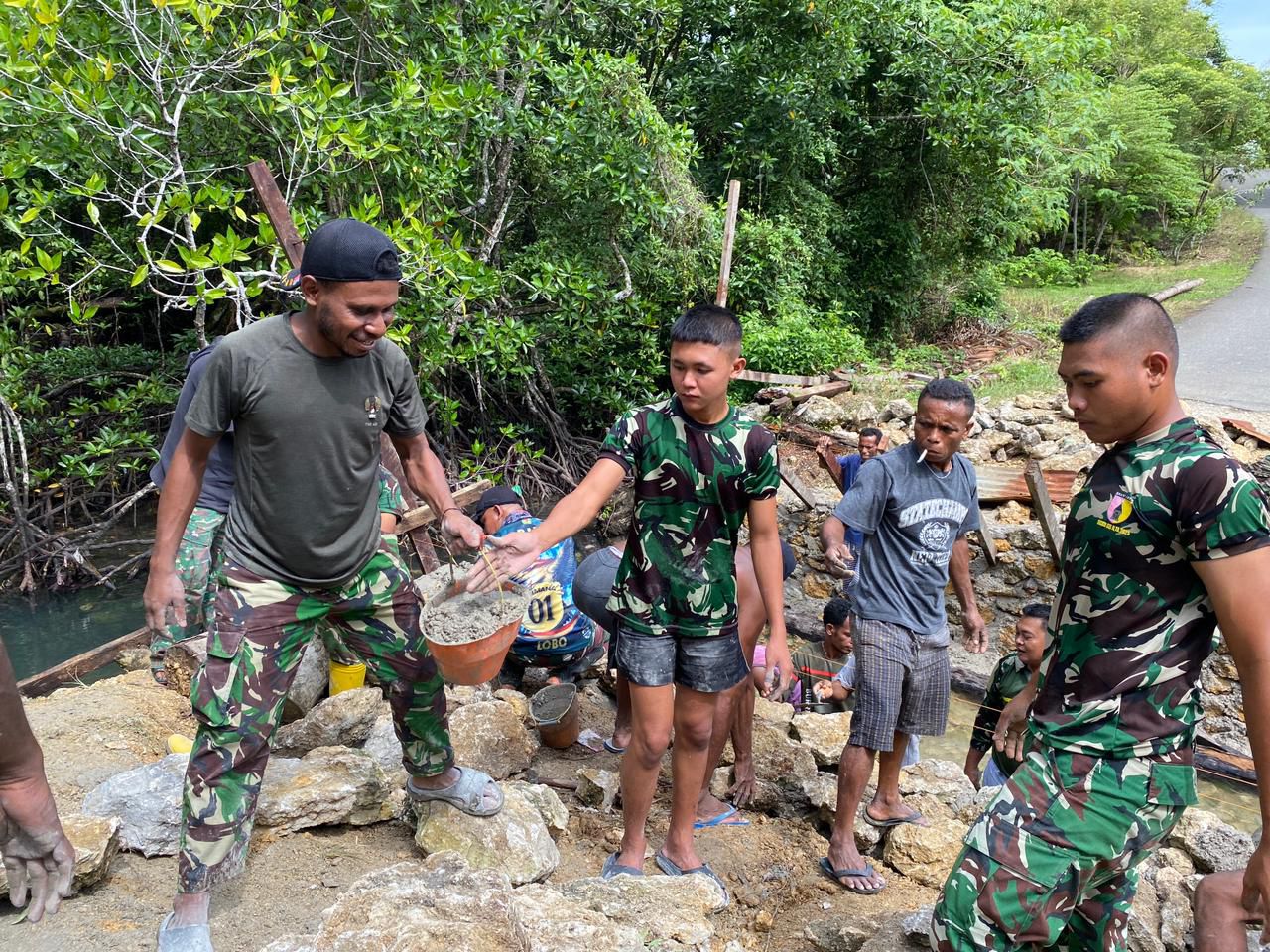 Kegiatan gotong royong ini melibatkan personel gabungan yang terdiri dari 15 anggota TNI AD, 4 personel TNI AL, 8 orang masyarakat setempat, serta 2 anggota Komponen Cadangan (Komcad). Sinergi lintas unsur ini mencerminkan semangat kebersamaan dan kemanunggalan TNI dengan rakyat yang menjadi ruh utama pelaksanaan TMMD.