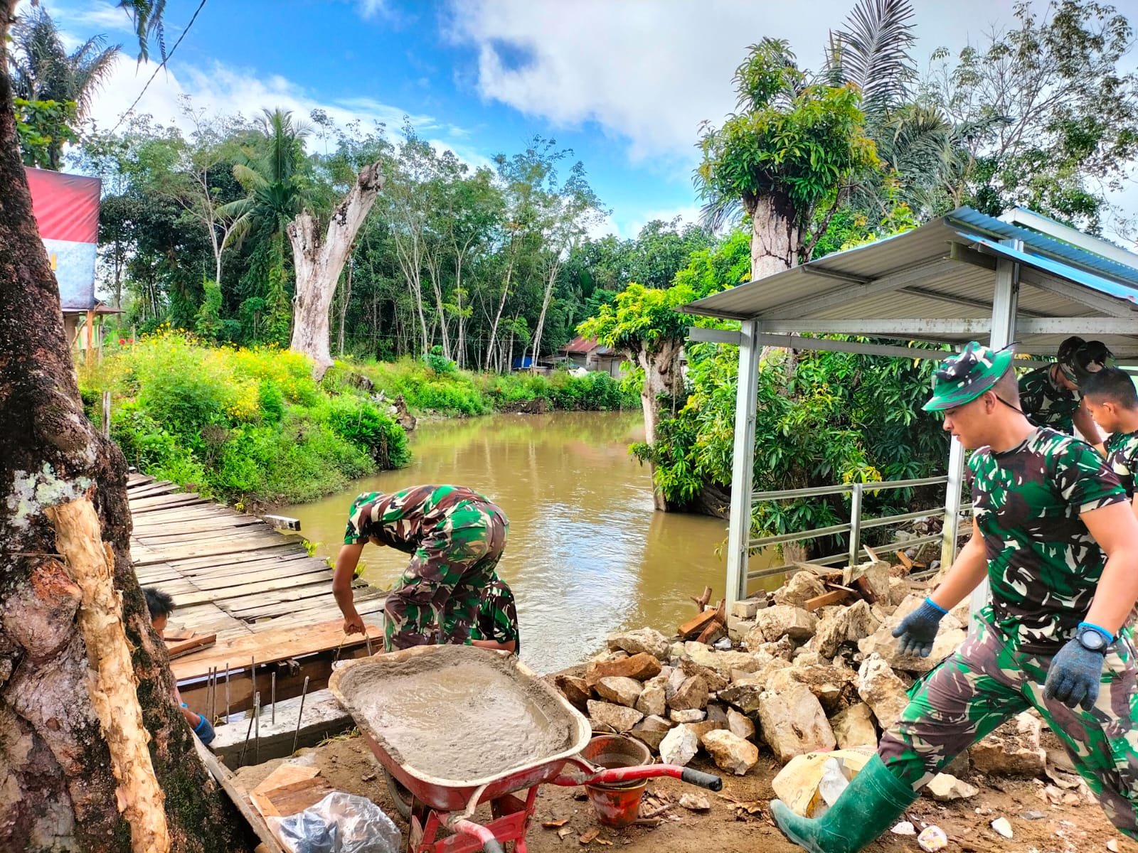 Anggota TNI dari Kodim 1002/HST bersama masyarakat setempat bahu-membahu melanjutkan pengerjaan jembatan yang menjadi akses vital bagi warga.