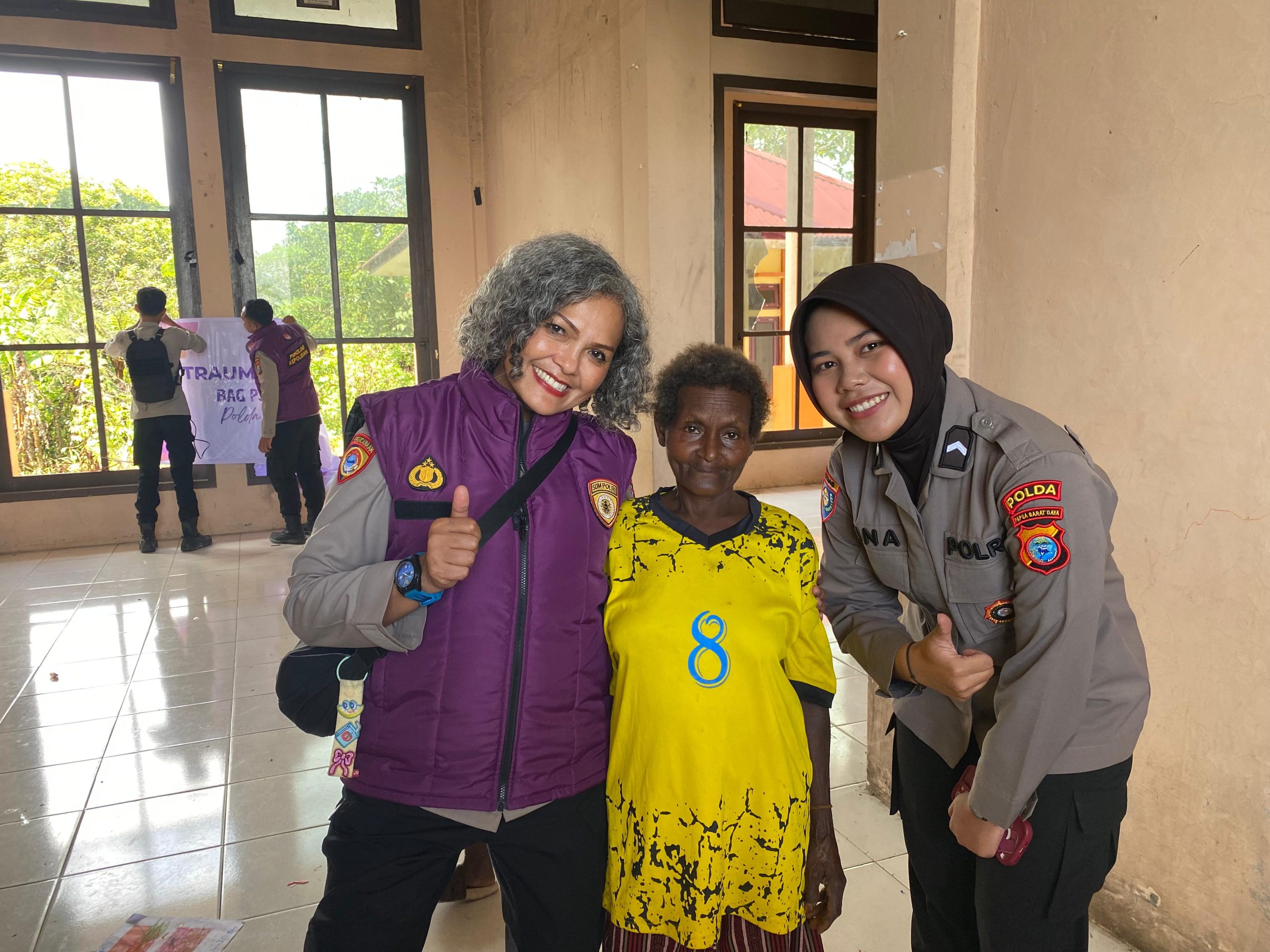Kegiatan ini juga dirancang agar mampu membangun kembali suasana kebersamaan. Para mama-mama kampung diajak untuk merajut bersama, sebuah aktivitas sederhana namun penuh makna yang menjadi ruang berbagi cerita dan mempererat hubungan emosional antara warga dan aparat. Di sisi lain, anak-anak terlihat ceria mengikuti kegiatan mewarnai serta menerima mainan, yang diharapkan mampu menghapus rasa takut dan menghadirkan kembali keceriaan masa kecil mereka.