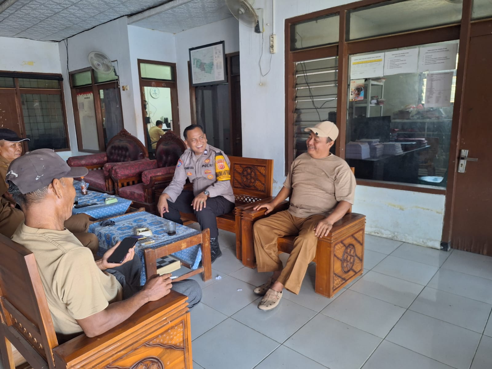 Dalam kunjungan tersebut, AIPTU Slamet Santoso tampak berbaur langsung dengan para pamong desa di ruang pelayanan kantor desa setempat.