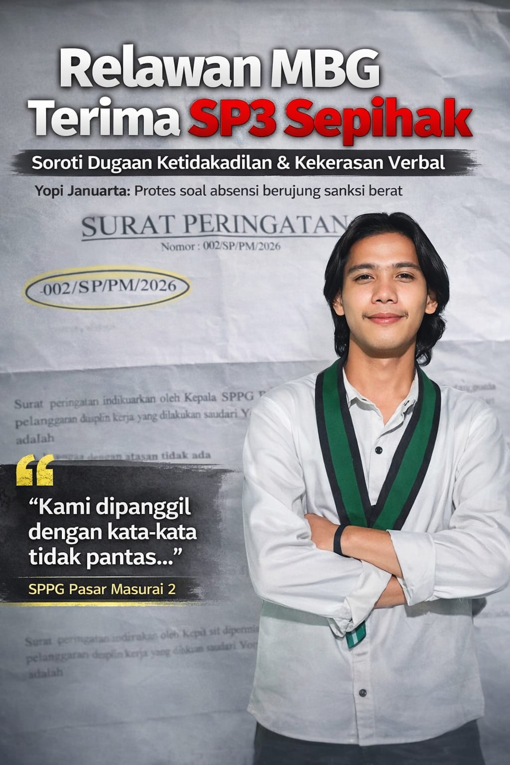 Lebih lanjut, Yopi menyebut Kepala SPPG Pasar Masurai 2, Aldi Hauzario, secara langsung menjatuhkan sanksi SP3 dengan nomor 002/SP/PM/2026. Ia menilai pemberian sanksi tersebut tidak melalui tahapan prosedural yang semestinya, seperti Surat Peringatan 1 (SP1) dan Surat Peringatan 2 (SP2).